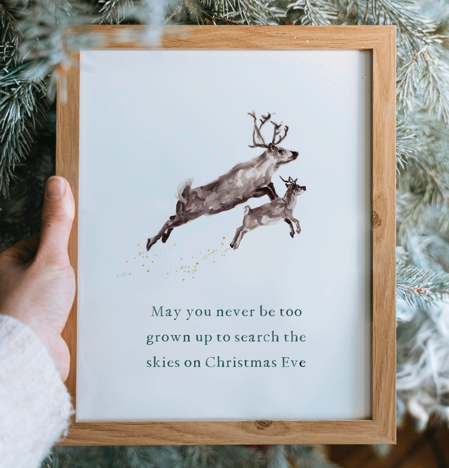 Capture the magic of the season with our“May You Never Be Too Grown Up to Search the Skies on Christmas Eve”watercolor reindeer print. This cozy artwork brings whimsical Christmas charm to your home, perfect for creating a warm, nostalgic holiday atmosphere. Whether displayed on a mantle, in a cabin, or as part of your festive wall art, it adds a timeless touch of Christmas wonder.