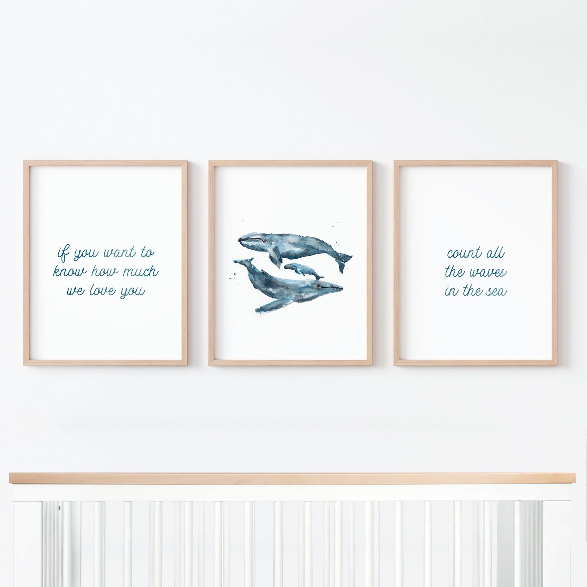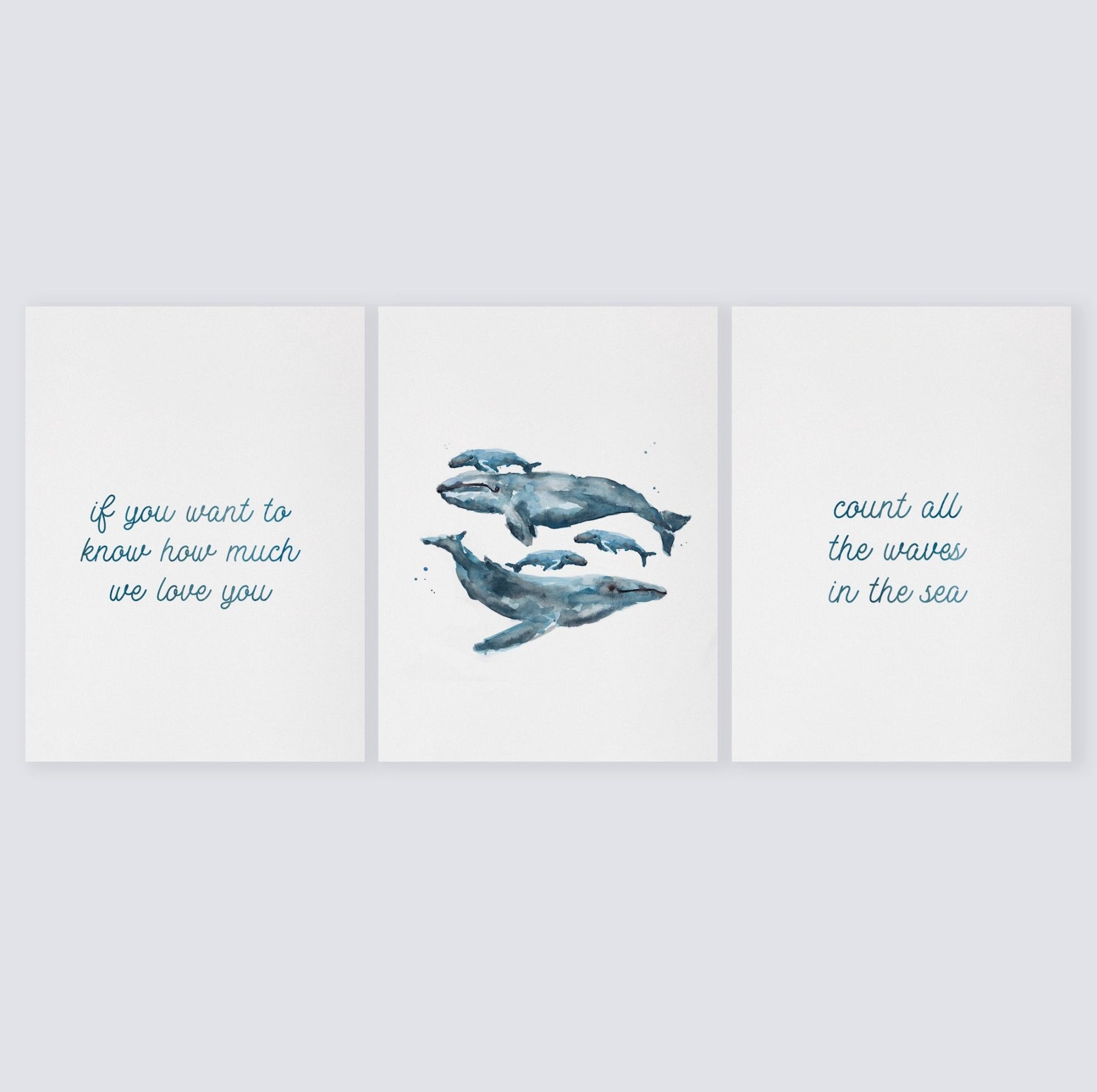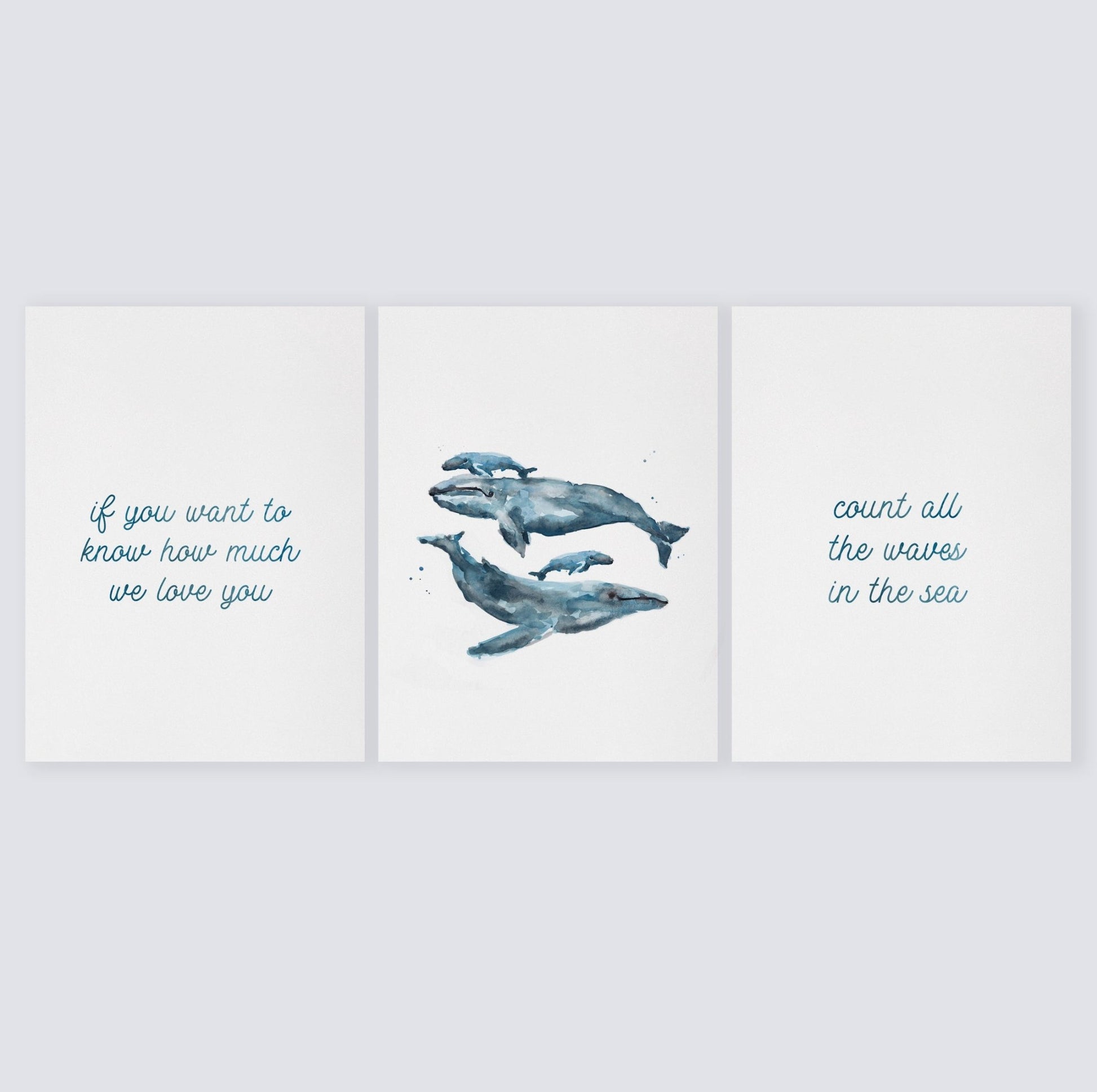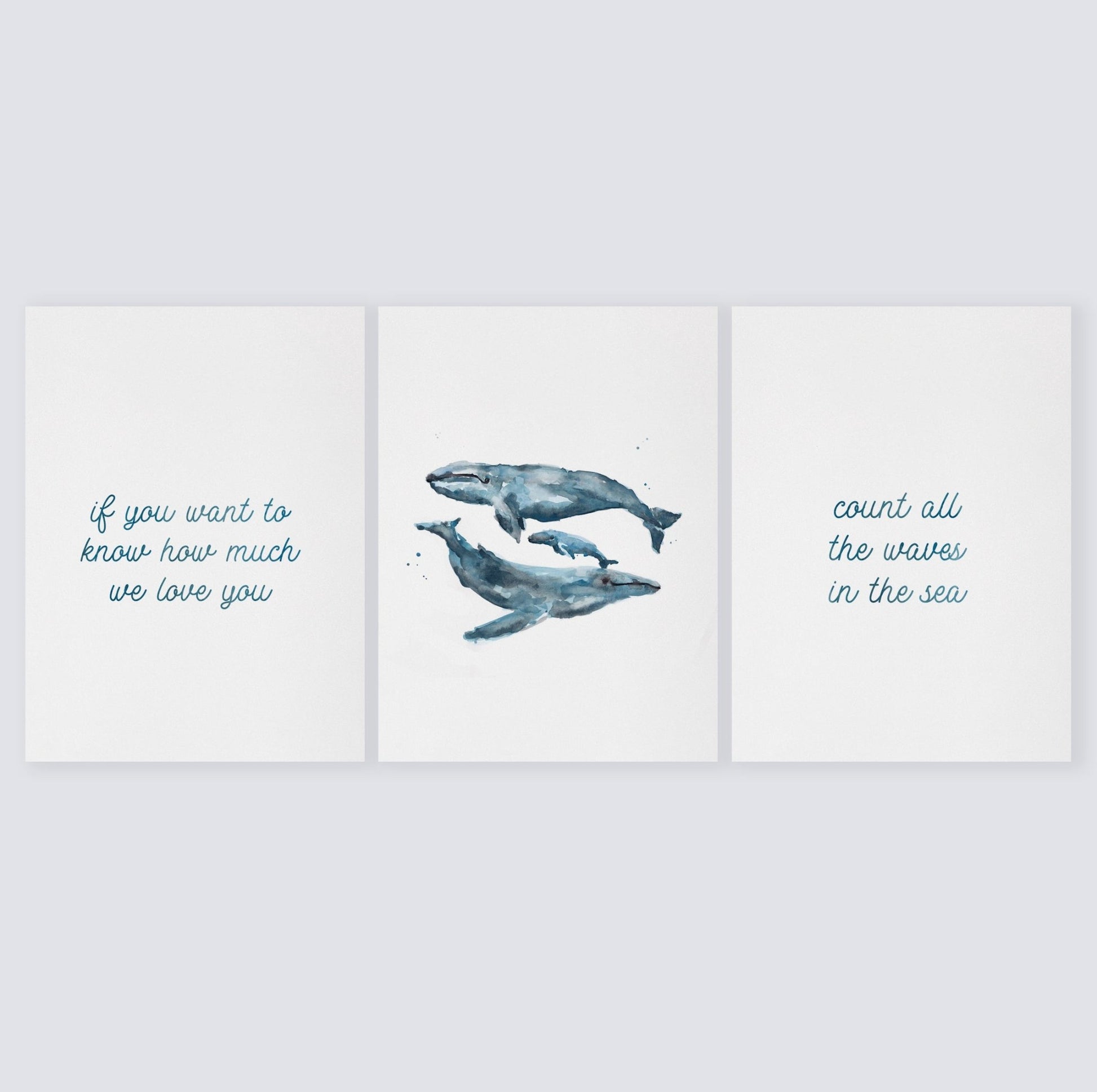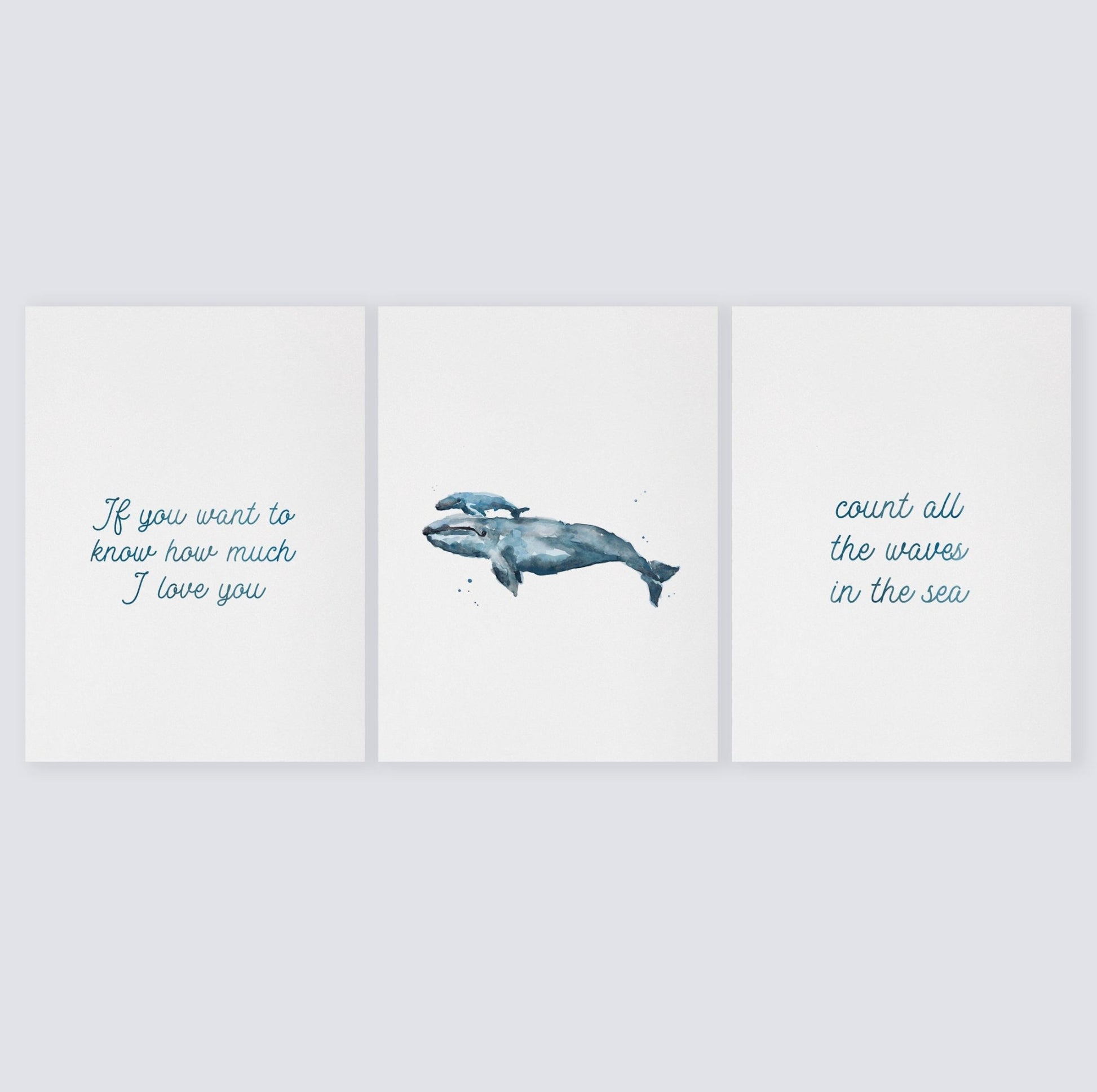As part of our ocean art collection, our "If you want to know how much I love you count all the waves in the sea" watercolor whale family 3 print set brings a sweet and playful touch to your little one's nautical nursery walls.
