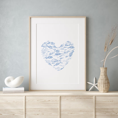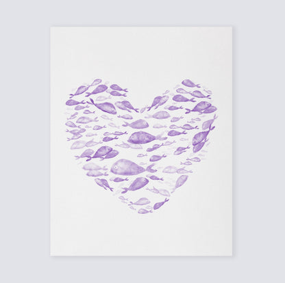 Our simple yet beautiful hand painted watercolor fish heart prints makes for an adorable large art statement piece to hang above a crib in a nautical nursery. It also makes for a playful addition to a beach house gallery wall.