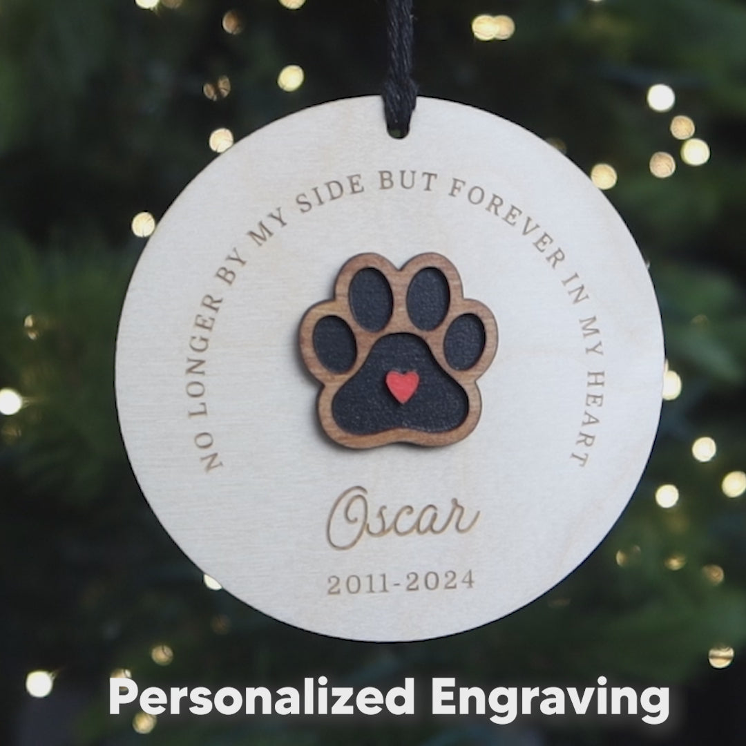 Remember your beloved pet with the No Longer By My Side But Forever in My Heart Personalized Pet Memorial Ornament, a touching keepsake for dog or cat loss. This engraved wood ornament offers comfort and remembrance, keeping their memory close during the holidays and beyond. A heartfelt sympathy gift for anyone missing their furry best friend.