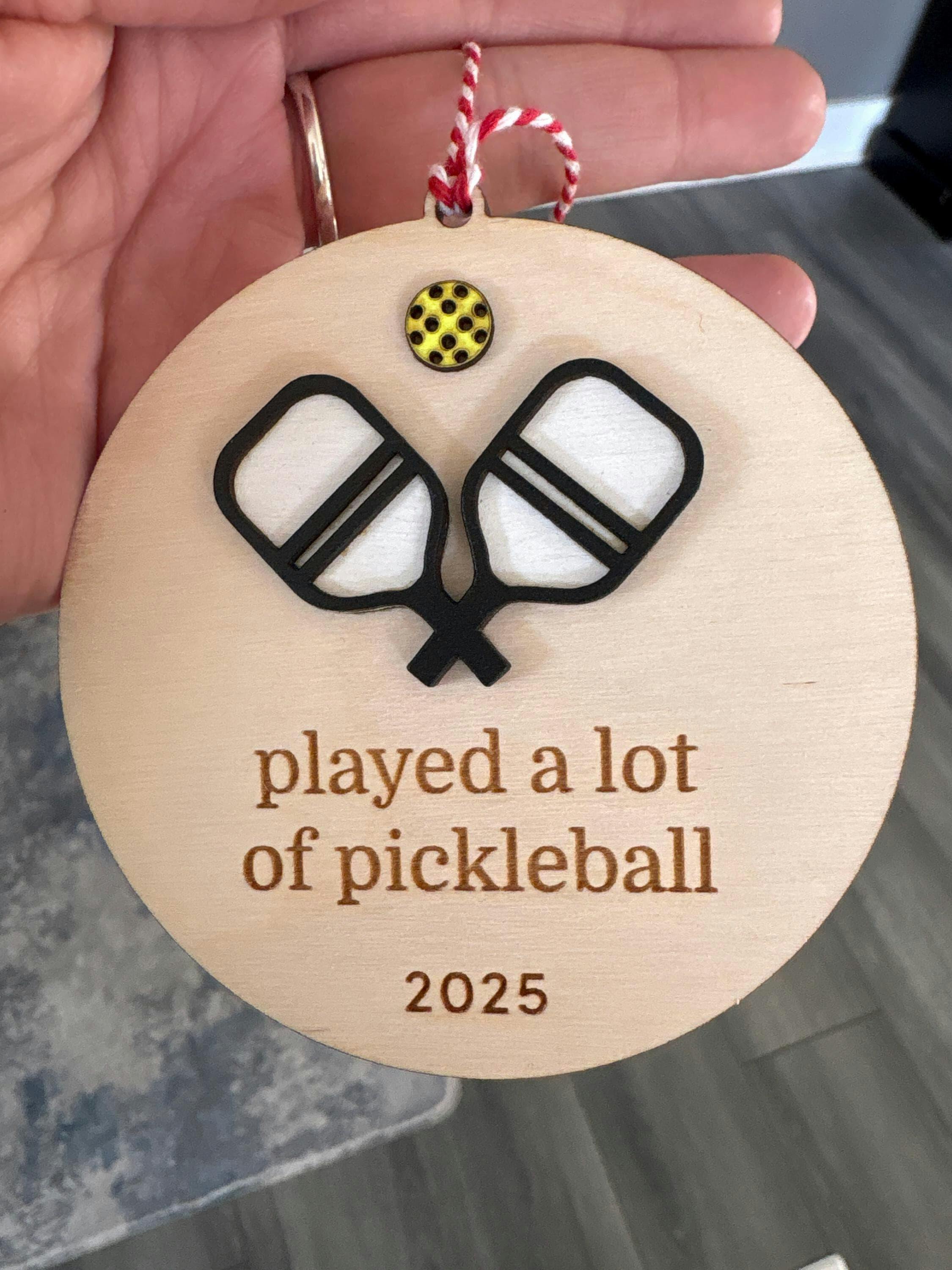 Celebrate your favorite player’s passion for pickleball with our “Played a Lot of Pickleball in 2025” Ornament — a fun and charming keepsake for the holidays. Handcrafted from engraved birch wood, this ornament captures the laughter, love, and friendly competition of the game. A perfect blend of humor and craftsmanship, it’s sure to bring smiles to any pickleball enthusiast’s tree.